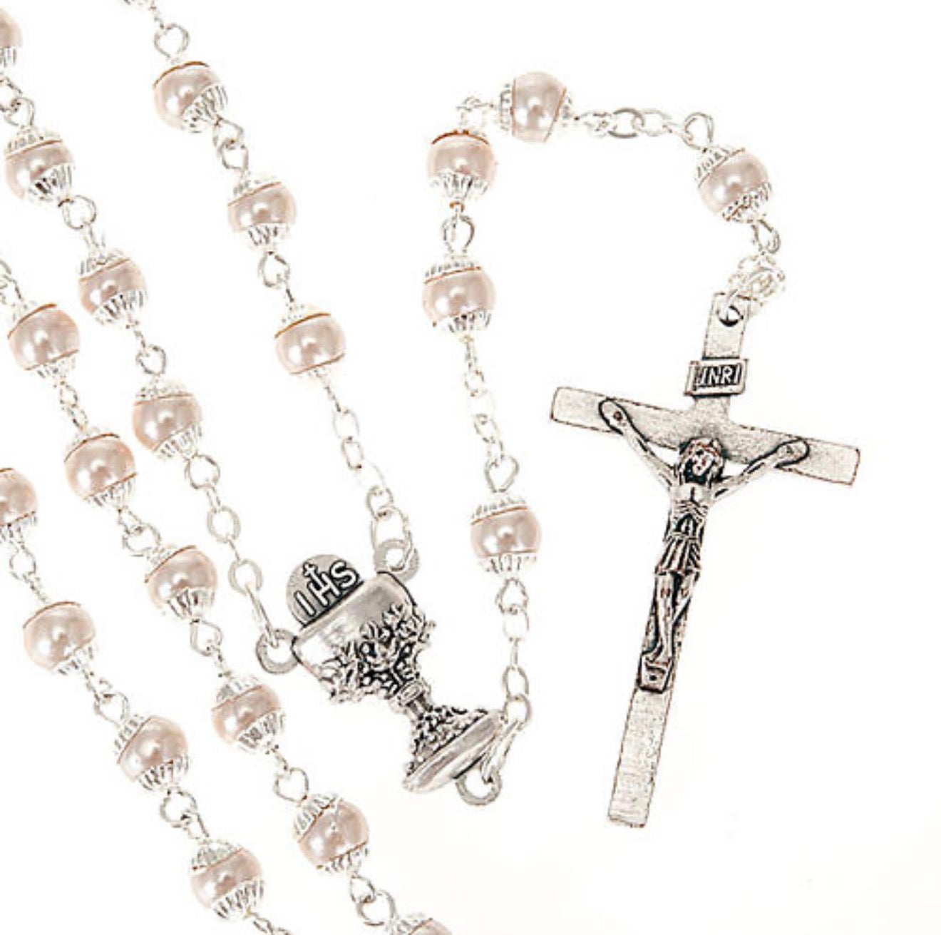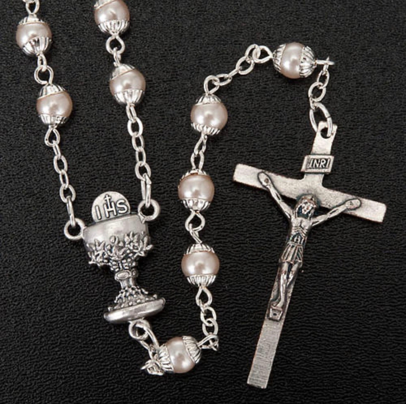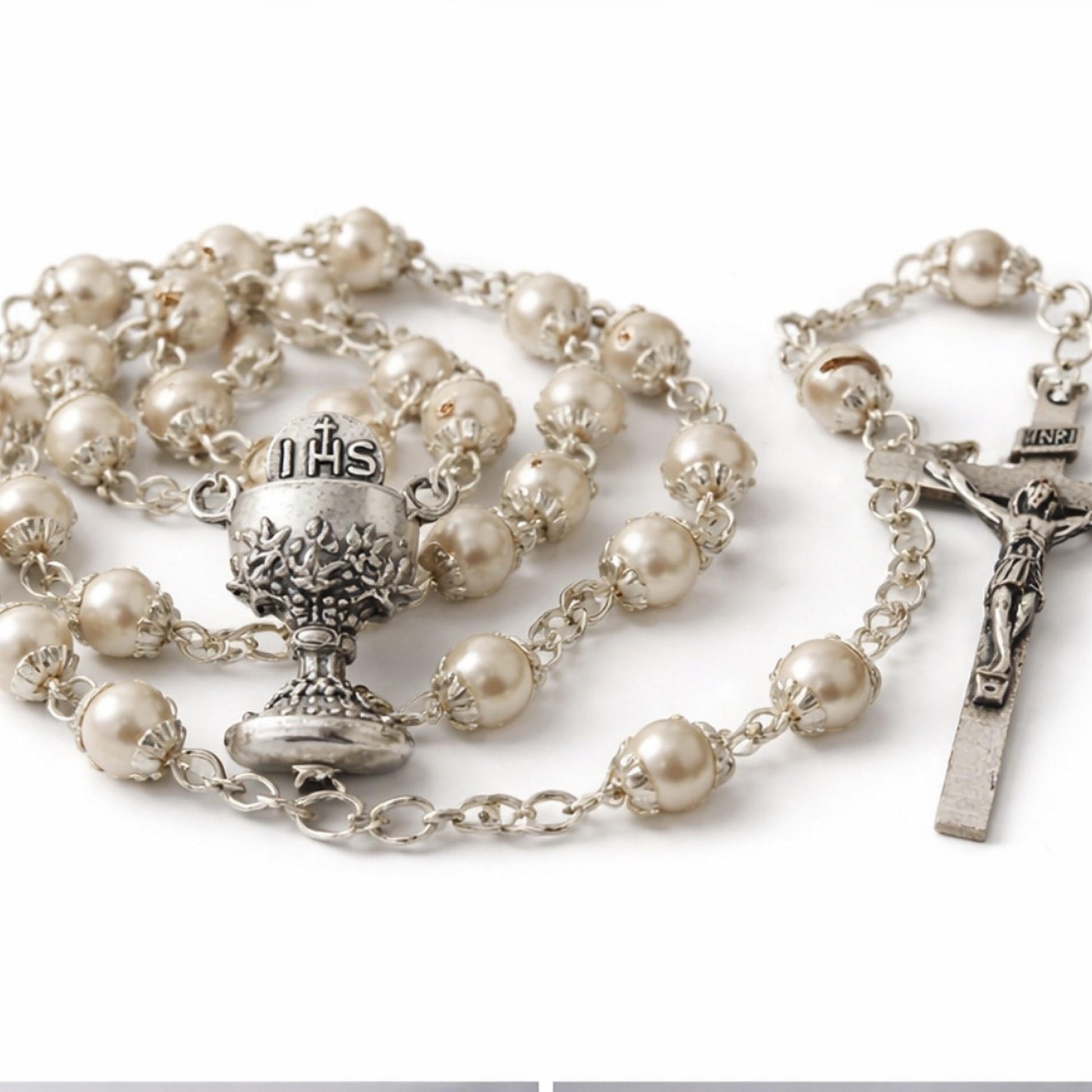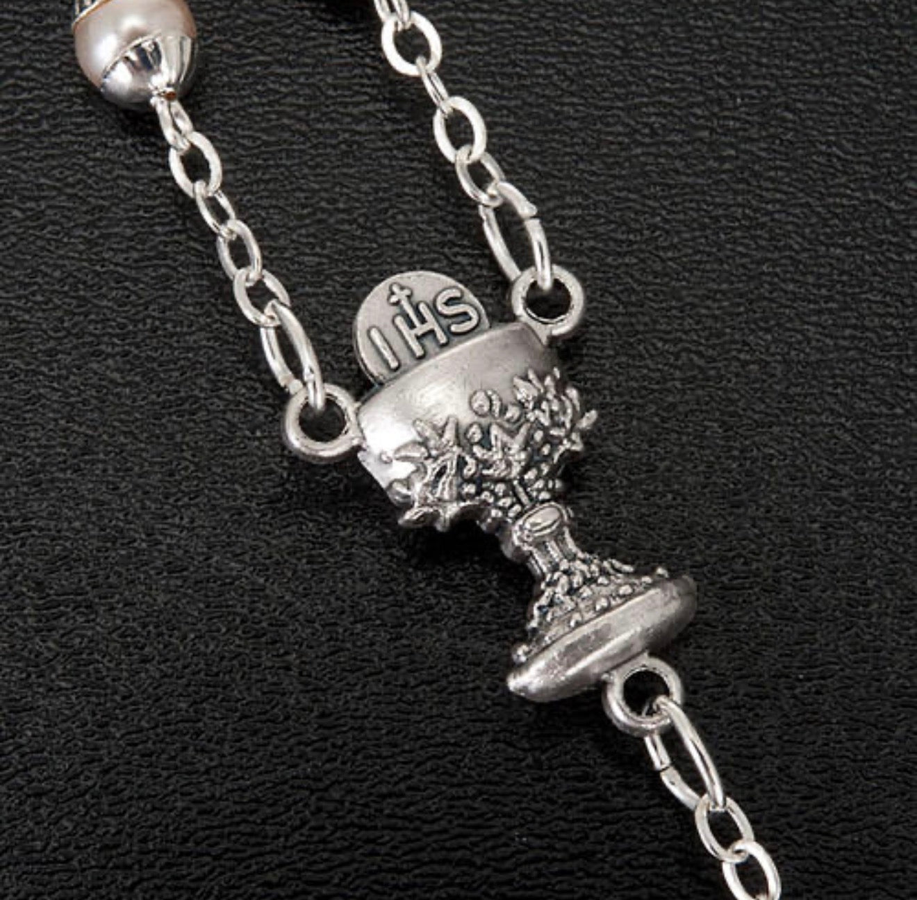 Die Perlen in edler Optik verleihen dem Rosenkranz eine besondere Ausstrahlung und machen ihn zu einem bedeutungsvollen Begleiter für diesen besonderen Anlass. Das fein gearbeitete Kreuz sowie das detailreiche Mittelstück mit „IHS“-Symbol unterstreichen den traditionellen Charakter.